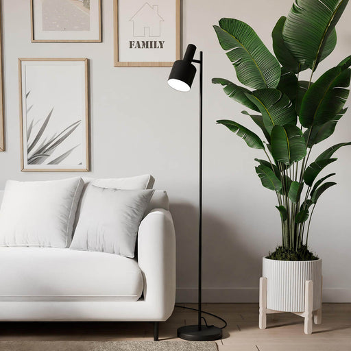 Modernisti muotoiltu mattamusta lattiavalaisin messinginvärisillä yksityiskohdilla. Suunnattava kupu antaa hyvää kohdevaloa sopien esimerkiksi oloh...